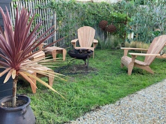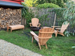Un salon Fauteuil Adirondack finition naturelle gamme pro, 4 Fauteuils, 2 Repose-Pieds et 1 Table, avec une superbe vue, en Normandie.